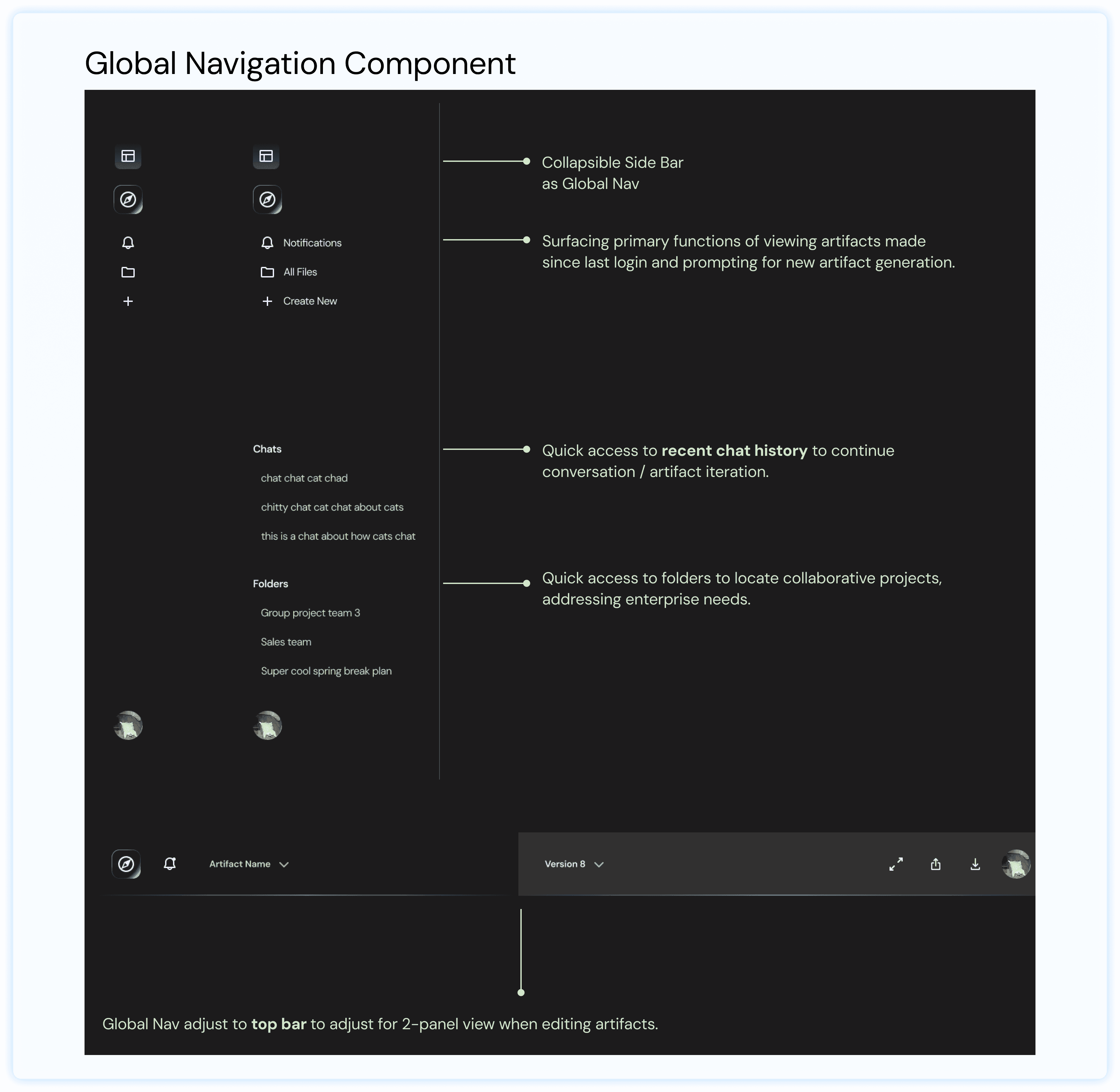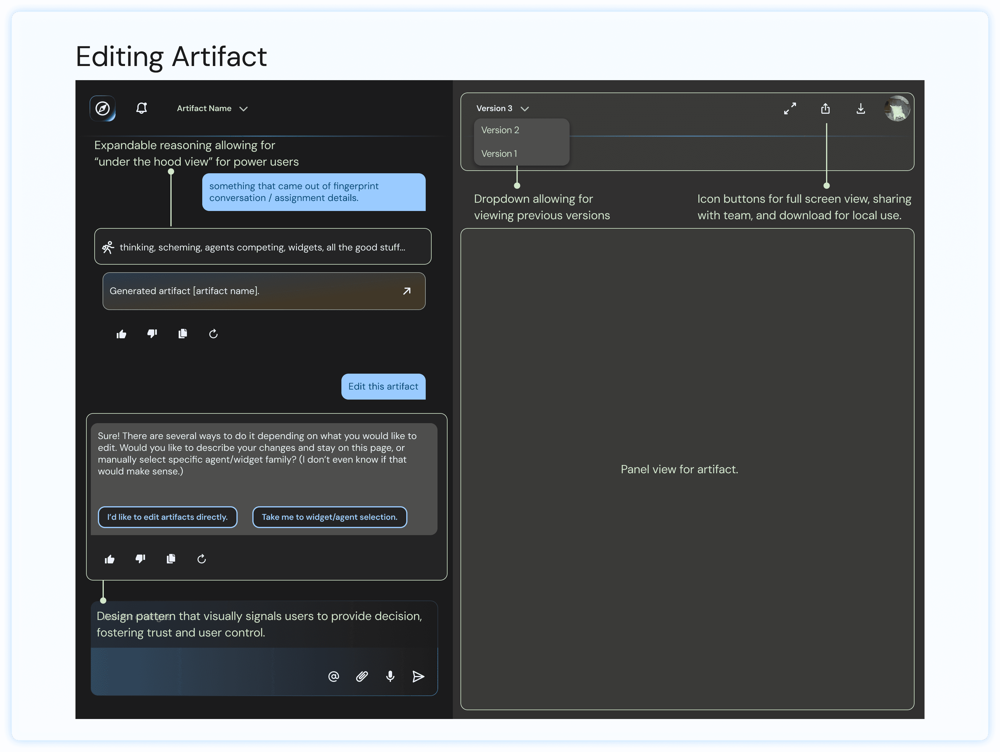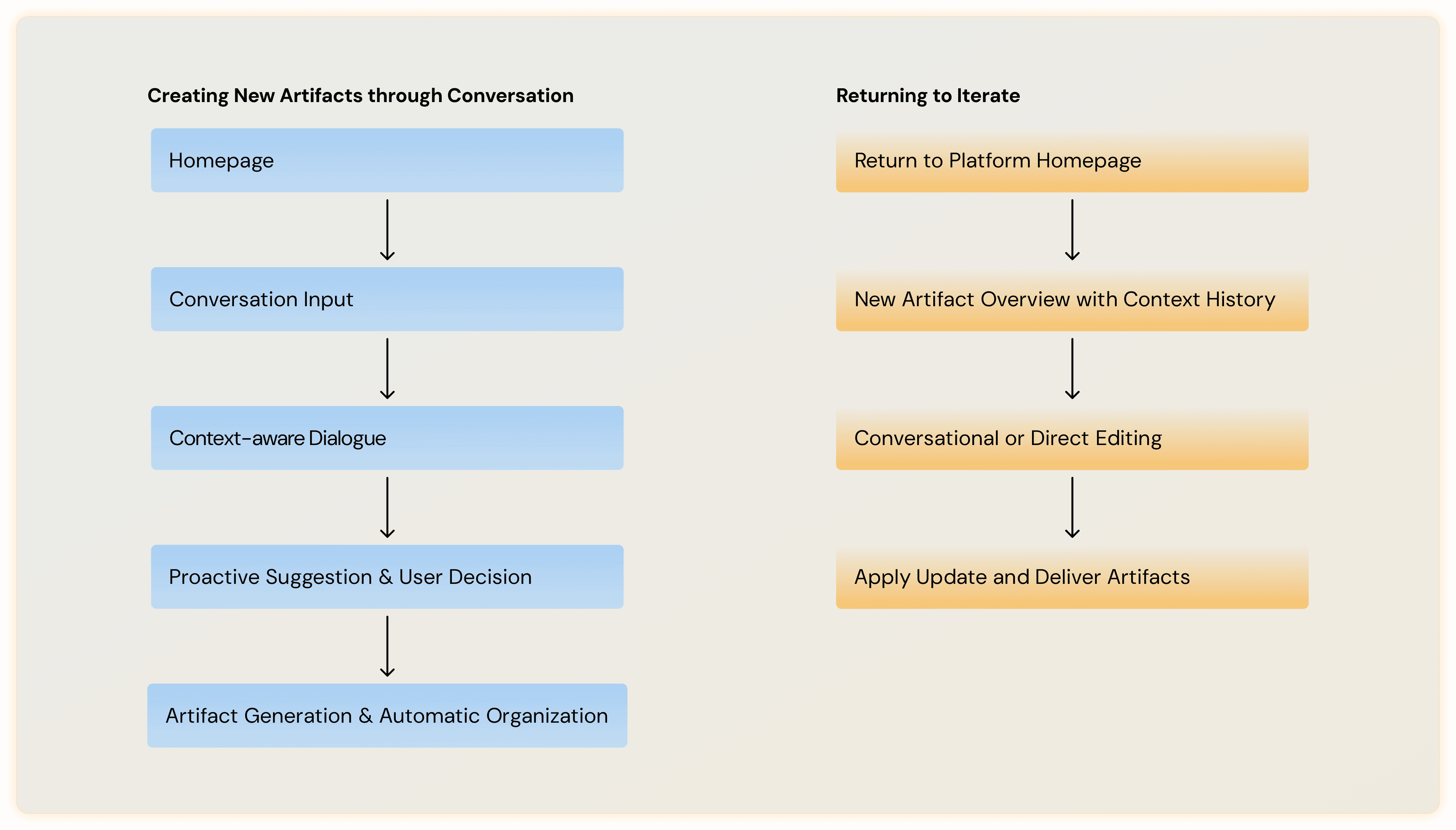 Parallel to UI kit and design pattern creation, we also produced high-fidelity prototypes for the two core user journeys: artifact creation via conversation and context-preserved editing upon return.