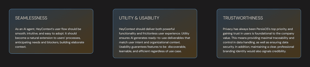 Based on user research, competitive analysis, and company mission, we established 3 core values to guide design decisions and product development.