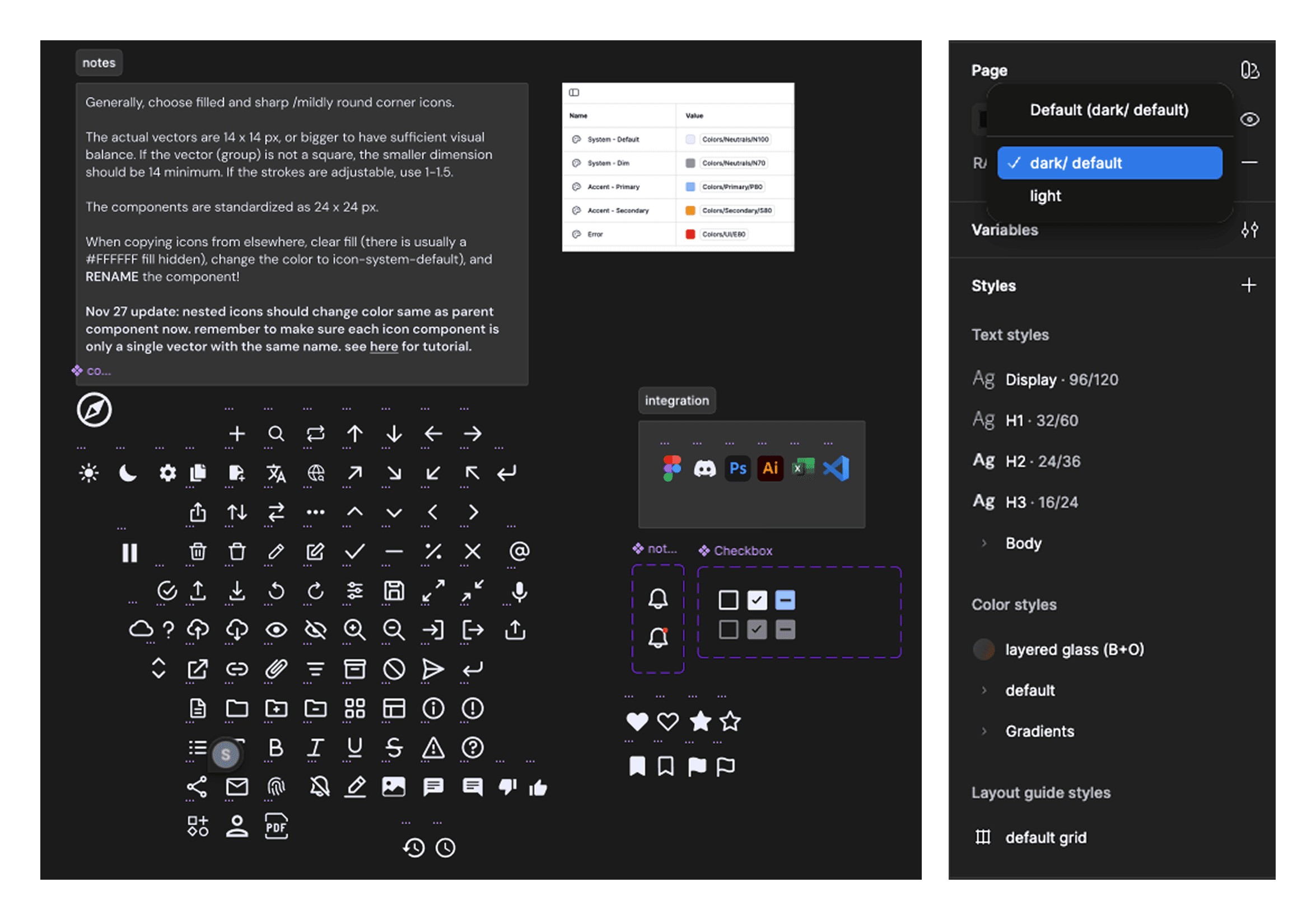 Variable Collections & Design Tokens: Token-based architecture with native light/dark modes, establishing a single source of truth for design decisions and ensuring design-development consistency.