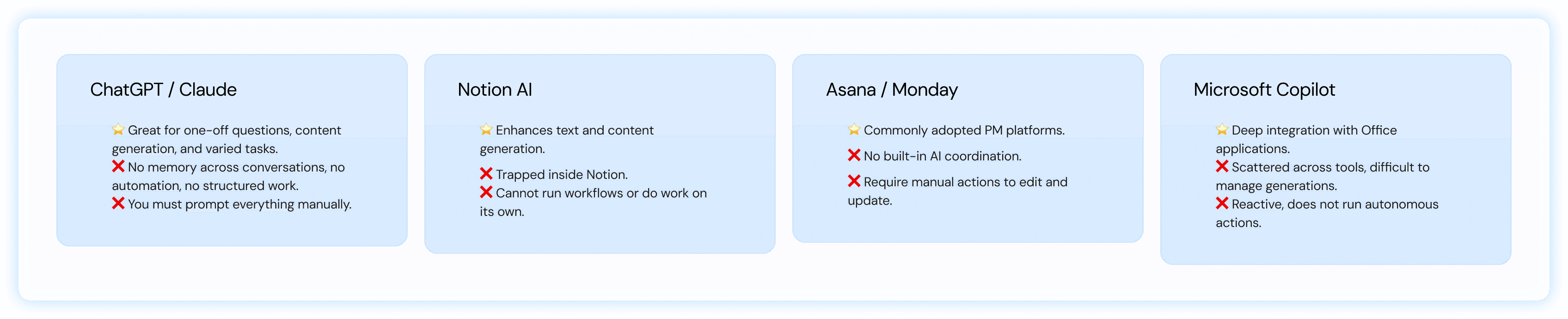 Through desk and market research, we also discovered the critical gap: no existing AI agentic product combines autonomous multi-agent coordination with persistent organization memory, structured deliverable generation, all the while without manual prompts.