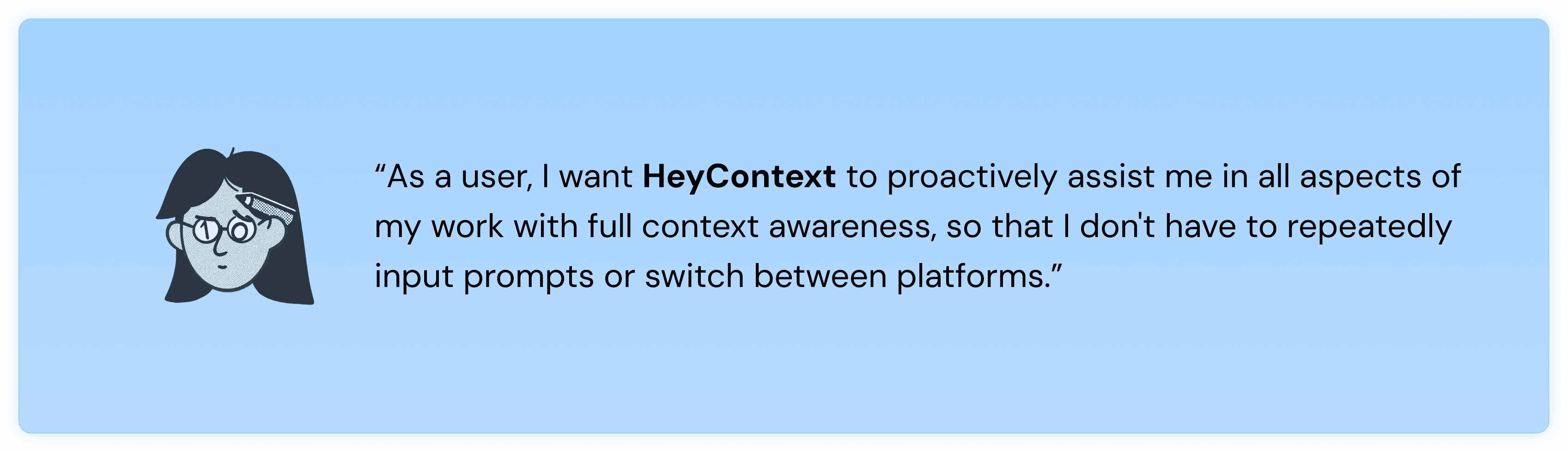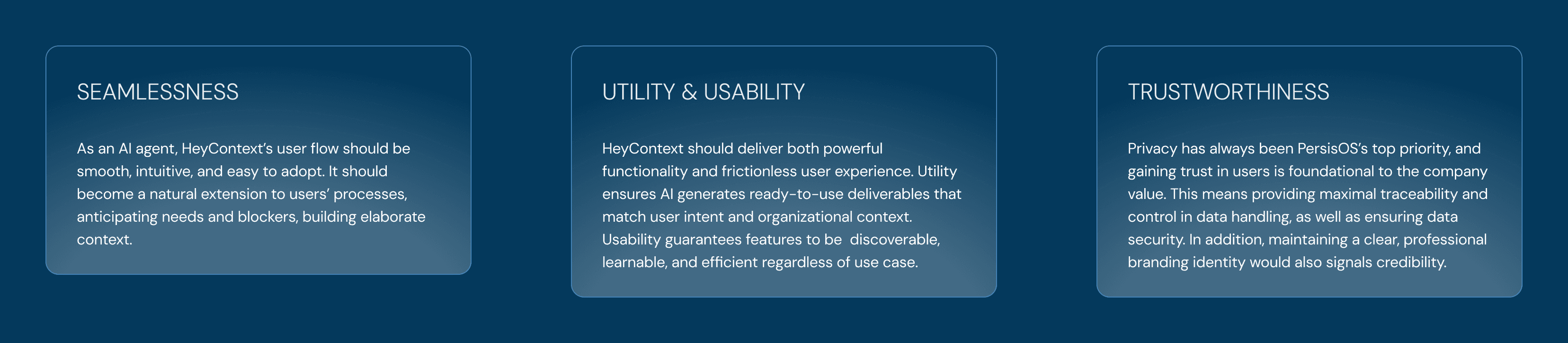 My work at HeyContext began by synthesizing insights from 9 baseline interviews with individuals of varying AI use that asked about their existing frustrations, expectations, and wishes for AI platforms.