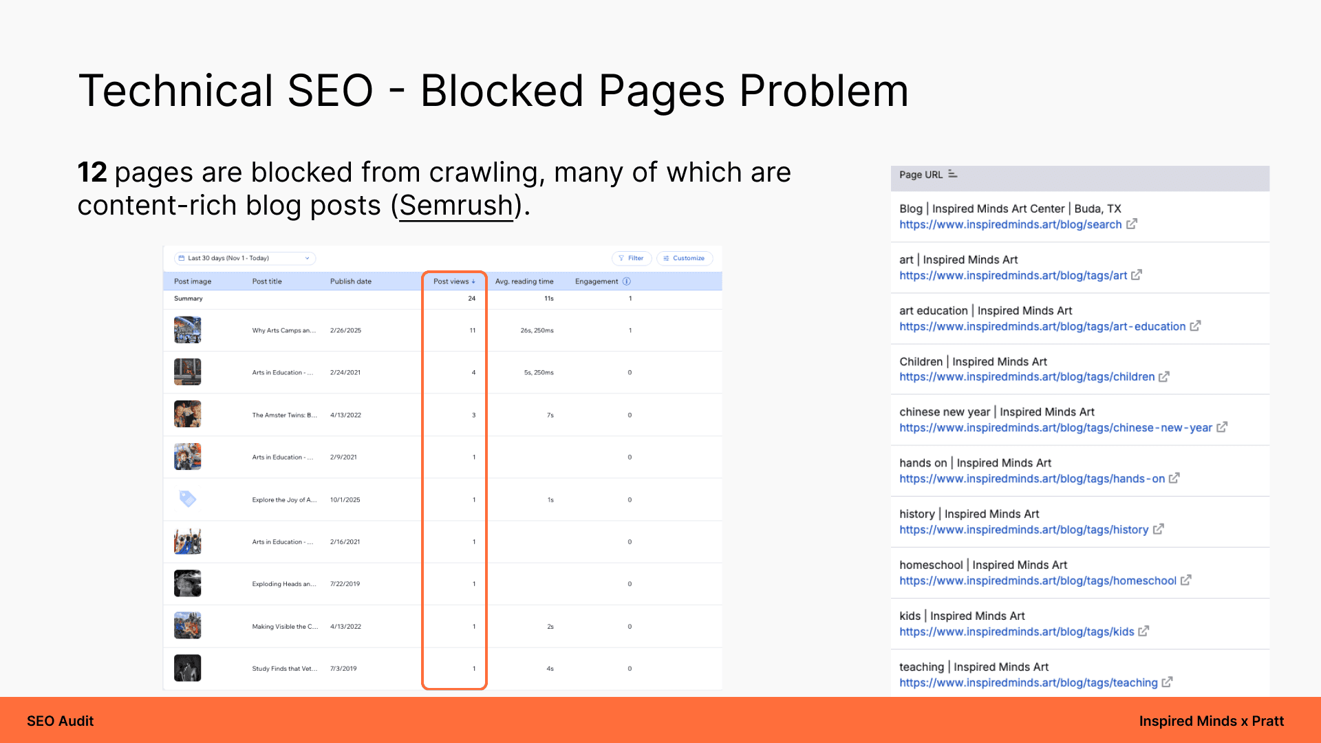 At the same time, Wix analytics uncovered that existing blog content generated minimal engagement or organic visibility, which is a significant missed opportunity. We flagged this to be critical for improving search indexing and capturing organic traffic through existing assets.