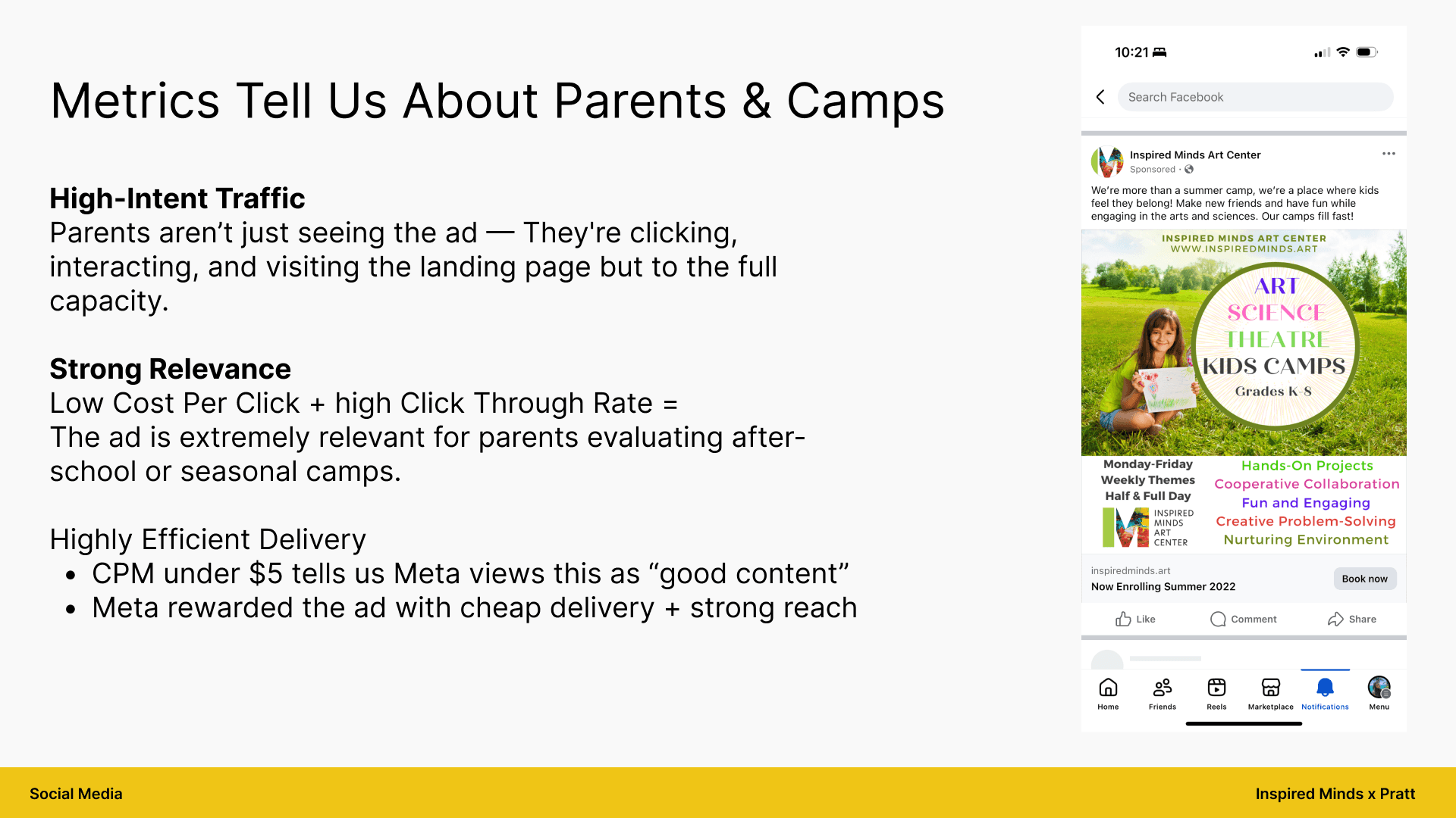 As the stakeholders had expressed their frustration with assessing their investments and performance on Meta Ads, we took the time to look into the campaign data and address the knowledge gap, providing high-level interpretations that connected specific metrics to strategic business objectives. In addition, we also offered clear guidance and demos for optimization.