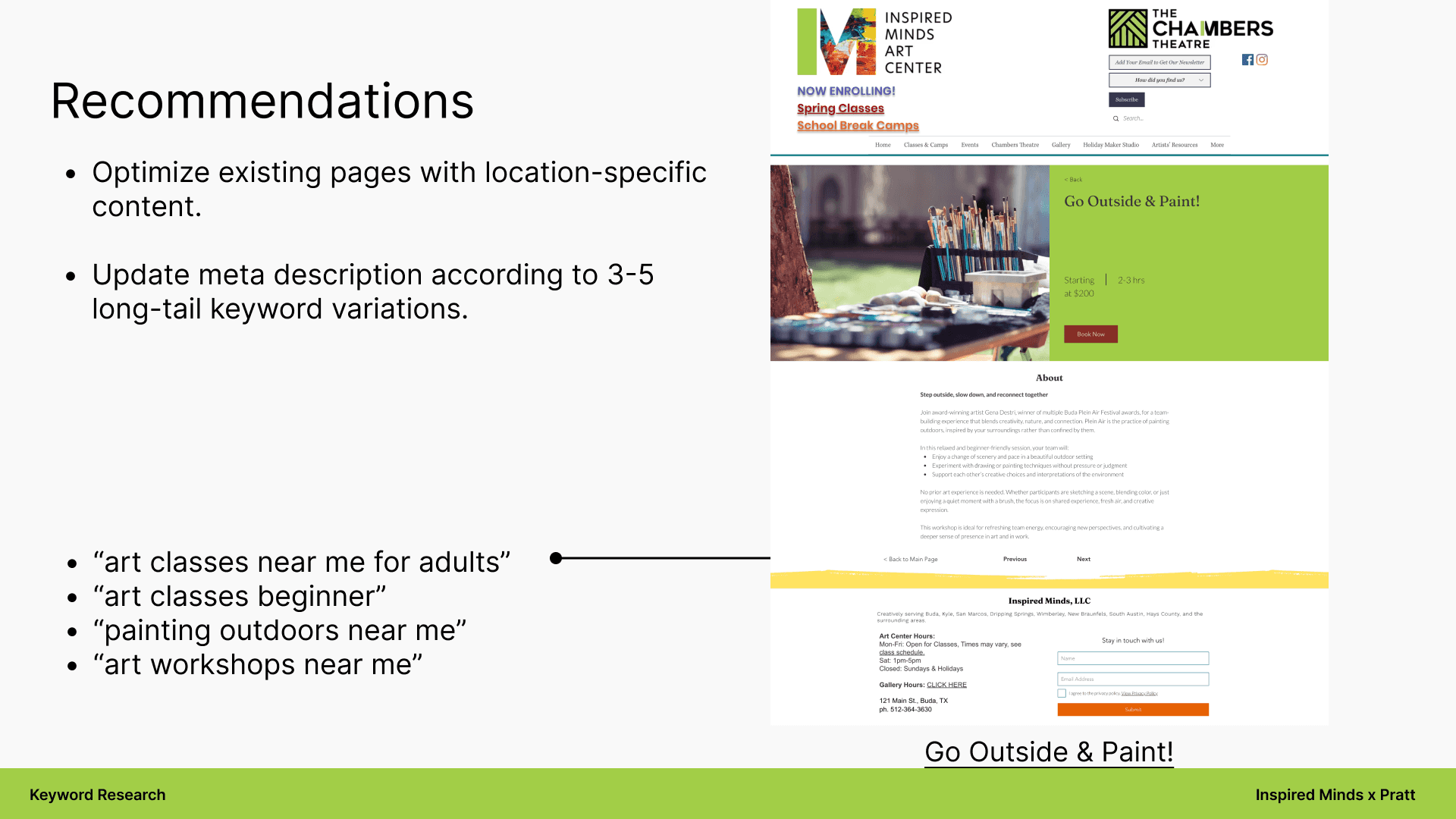 A designer by trade, given the opportunity, I would love to implement some of the recommendations we proposed, to incorporate them into a website redesign, and to use methods like A/B testing to validate. Embedding SEO and UX best practices into the website design would provide Inspired Minds with durable competitive positioning in their local market.