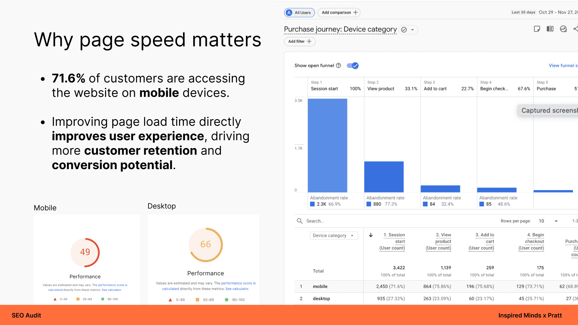 Our analysis revealed that 71.6% of site traffic originated from mobile devices, establishing mobile optimization and page load time reduction as critical priorities for reducing abandonment rates.